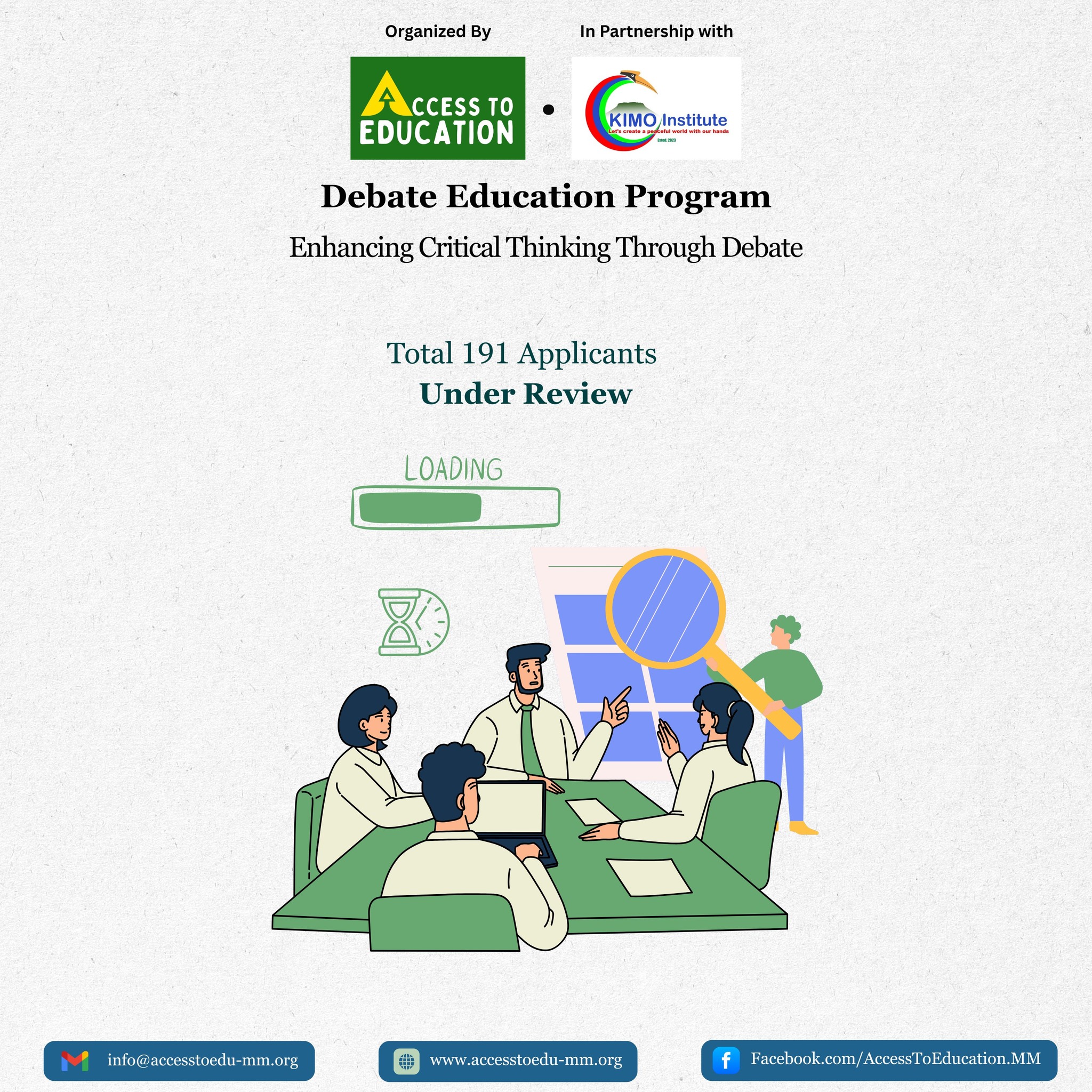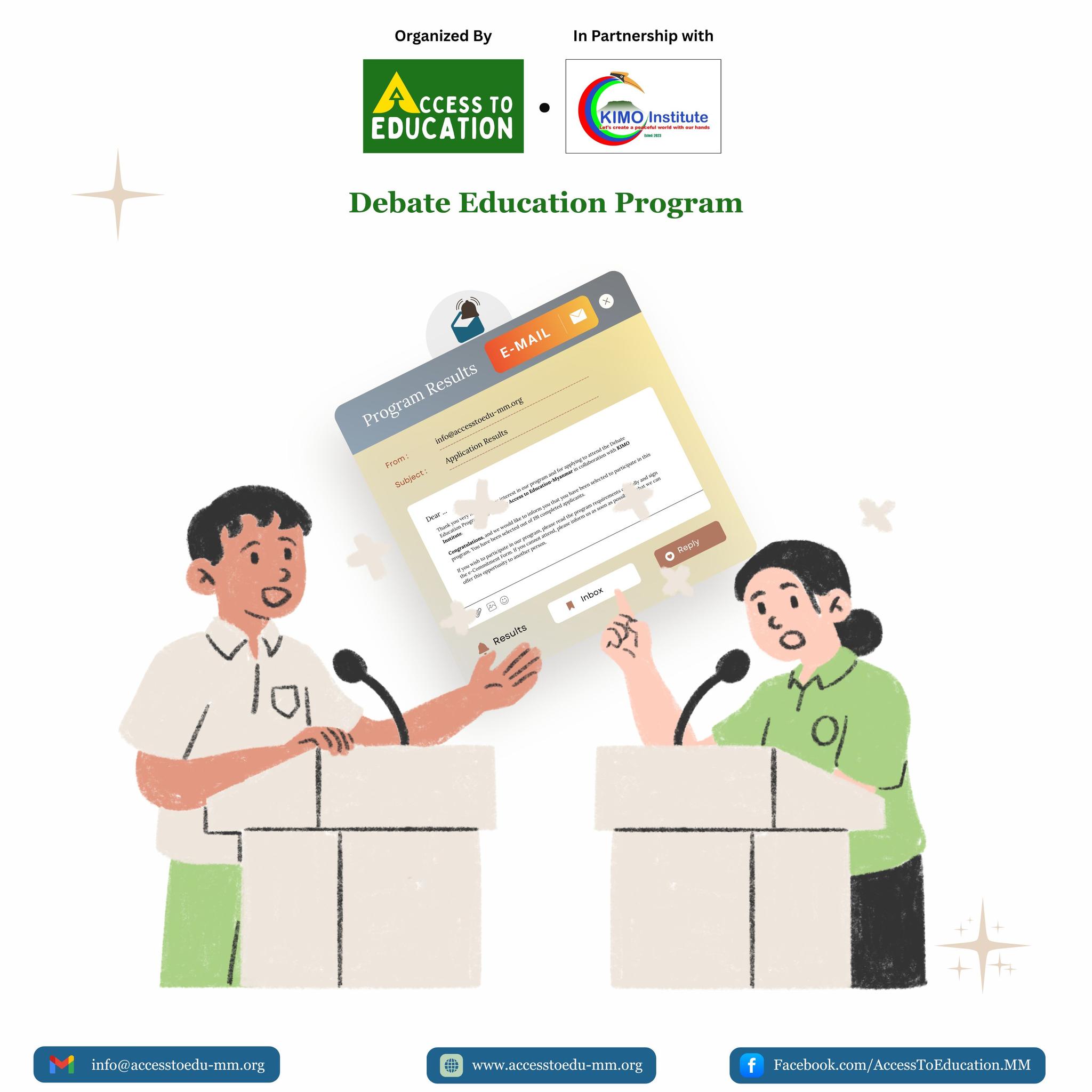 Congratulations… Debate Education Program အစီအစဉ်မှာ ရွေးချယ်ခံရတဲ့သူတွေကို အီးမေလ်းကတဆင့် ဆက်သွယ်အကြောင်းကြားထားပြီး ဖြစ်ပါတယ်။ ရွေးချယ်ခံခဲ့ရသူများ အနေနဲ့ မိမိတို့ Email ရဲ့ Inbox၊ Spam (ဒါမှမဟုတ်) Junk mail box တွေကို သေသေချာချာ ပြန်လည်စိစစ်ပြီး ဆက်လက်လုပ်ဆောင် ပေးပို့ရမယ့် အချက်အလက်တွေကို ဇူလိုင်၊ ၁၆ ရက်နေ့၊ မြန်မာအချိန် ည (၁၀) နာရီ နောက်ဆုံးထားပြီး ပြန်လည်ပေးပို့ဖို့ လိုအပ်ပါမယ်။ မေးမြန်းလိုတဲ့ မေးခွန်းတွေ၊ အချက်အလက်တွေ ရှိရင်လည်း Access To Education – Myanmar ရဲ့ အီးမေလ်းဖြစ်တဲ့ accesstoeducation.mm@gmail.com သို့မဟုတ် info@accesstoedu-mm.org ကို ဆက်သွယ်မေးမြန်းနိုင်ပါတယ်။ #AccesstoEducationMyanmar #Debate #Education…