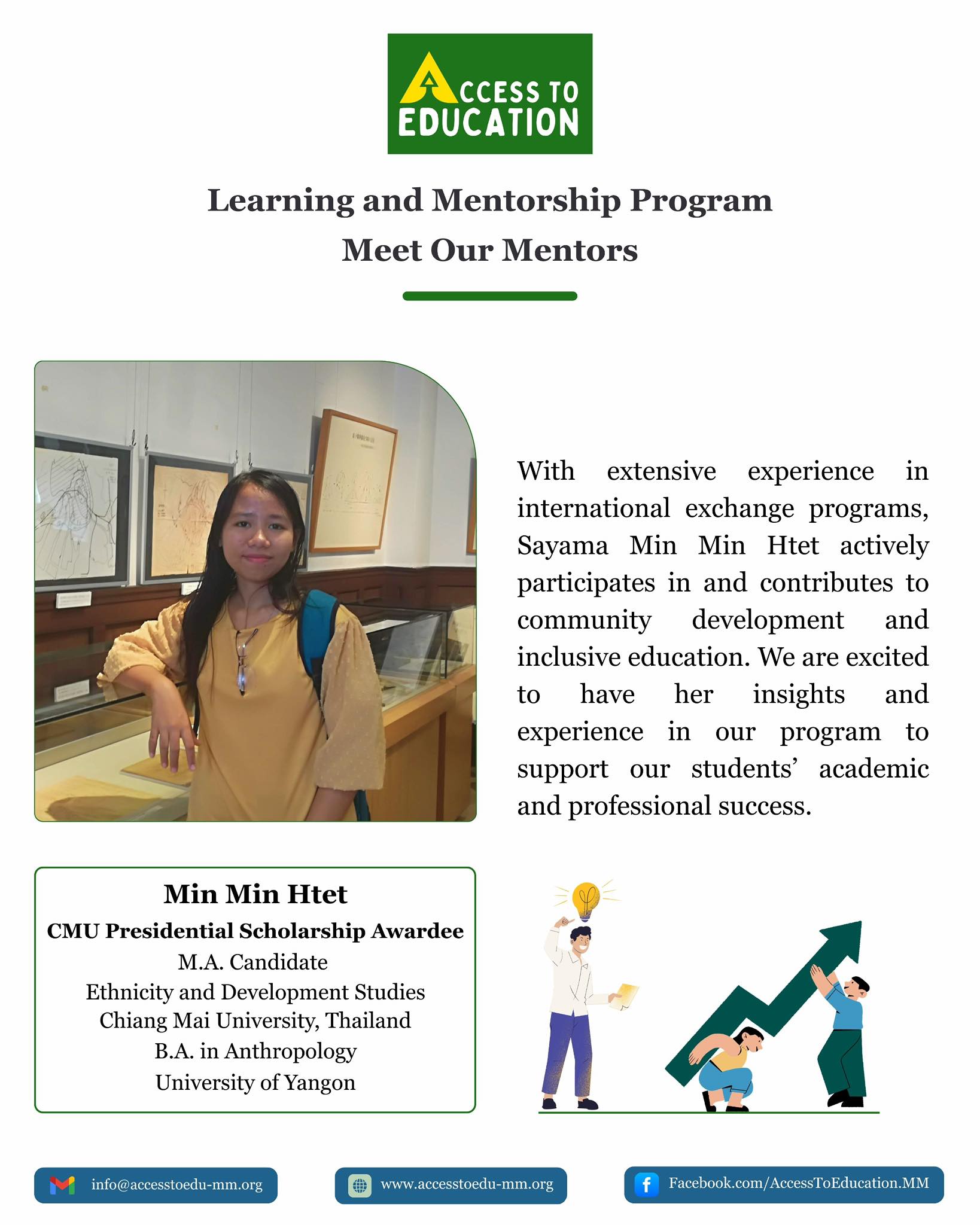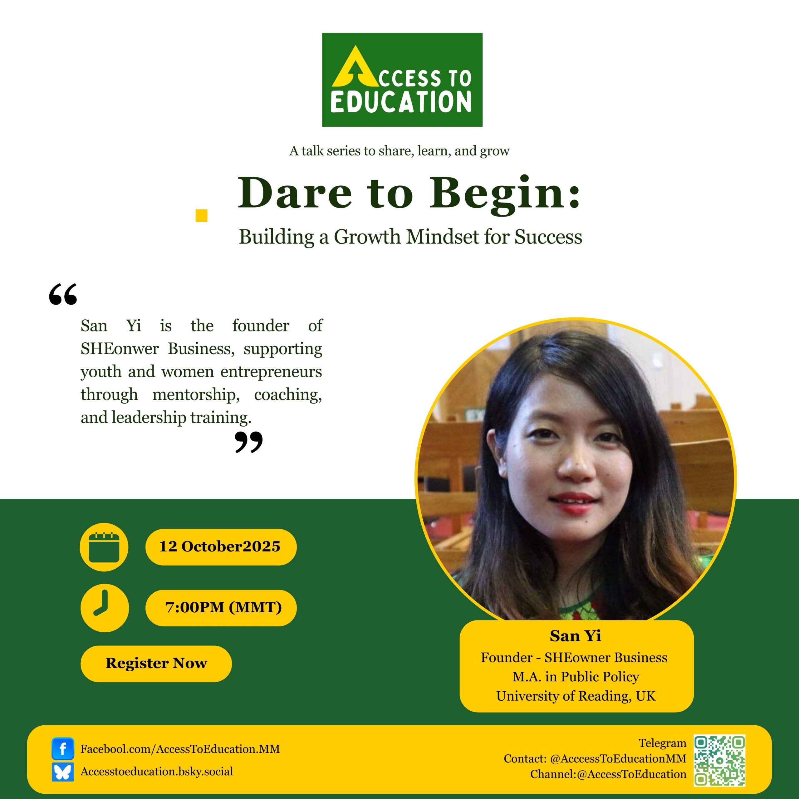 မင်္ဂလာပါ…။ Access to Education-Myanmar မှ ကျောင်းသူကျောင်းသား လူငယ်များအတွက် စဉ်ဆက်မပြတ် ပညာသင်ယူခွင့်ရရှိရန် တထောင့်တနေရာမှ အားထုတ်ကြိုးပမ်းဆောင်ရွက်နေပါတယ်။ ဒီအပတ်ရဲ့ စကားဝိုင်းမှာတော့ “Dare to Begin: Building a Growth Mindset for Success” ဆိုတဲ့ ခေါင်းစဥ်နဲ့ ဆွေးနွေးသွားမှာဖြစ်ပါတယ်။ ဒီခေါင်းစဉ်အောက်မှာတော့ “Growth Mindset” ဆိုတာ ဘာလဲ။ အခက်ခဲတွေ၊စိန်ခေါ်မှုတွေကို ဘယ်လိုနည်းလမ်းနဲ့ ဖြေရှင်းမလဲ။ ကိုယ့်ရဲ့ အားနည်းချက်၊အားသာချက်၊ စိတ်ဝင်စားမှုတွေကို ဘယ်လိုနည်းလမ်းတွေနဲ့ ရှာဖွေမလဲ။ စတဲ့အကြောင်းအရာတွေကို ဆွေးနွေးမျှဝေသွားမှာ ဖြစ်ပါတယ်။ ဒီအစီအစဉ်ဟာ အခက်ခဲ အကြပ်တည်း အတွင်းမှ ကိုယ့်ရဲ့ ပညာရေး၊ အလုပ်အကိုင်နဲ့ ကိုယ့်ဘဝရည်မှန်းချက်အတွက် လမ်းဖောက်နေတဲ့ လူငယ်တွေအတွက် ရည်ရွယ်စီစဥ်ထားတဲ့ စကားဝိုင်းအစီအစဉ် ဖြစ်ပါတယ်။ ဆွေးနွေးမျှဝေပေးမည့်သူဖြစ်တဲ့…